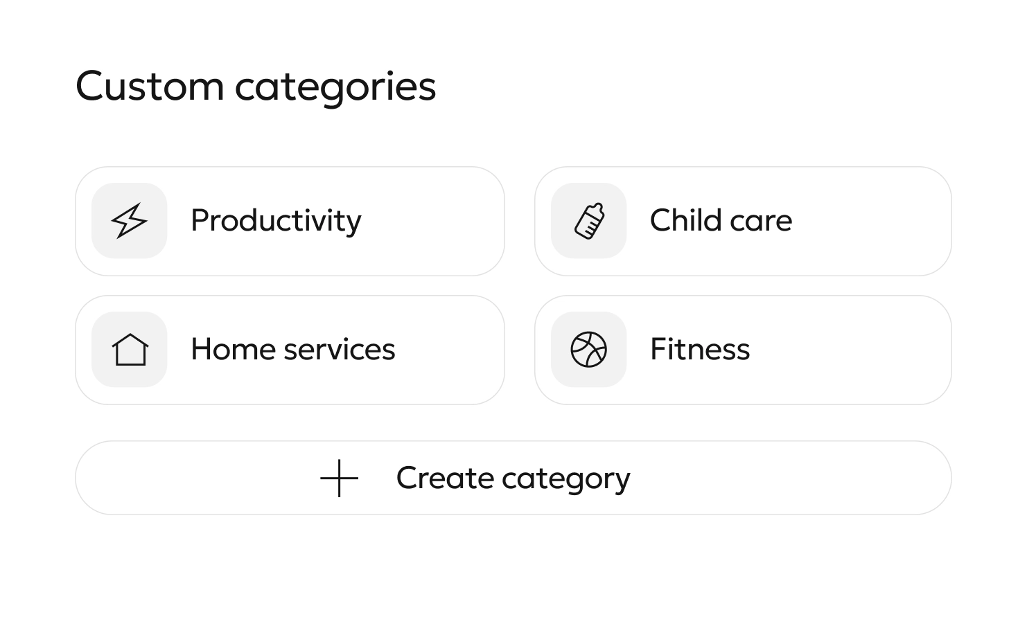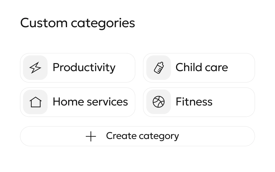 We all think about our money a little differently. So in addition to the default categories, you can categorize your transactions however you want.