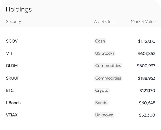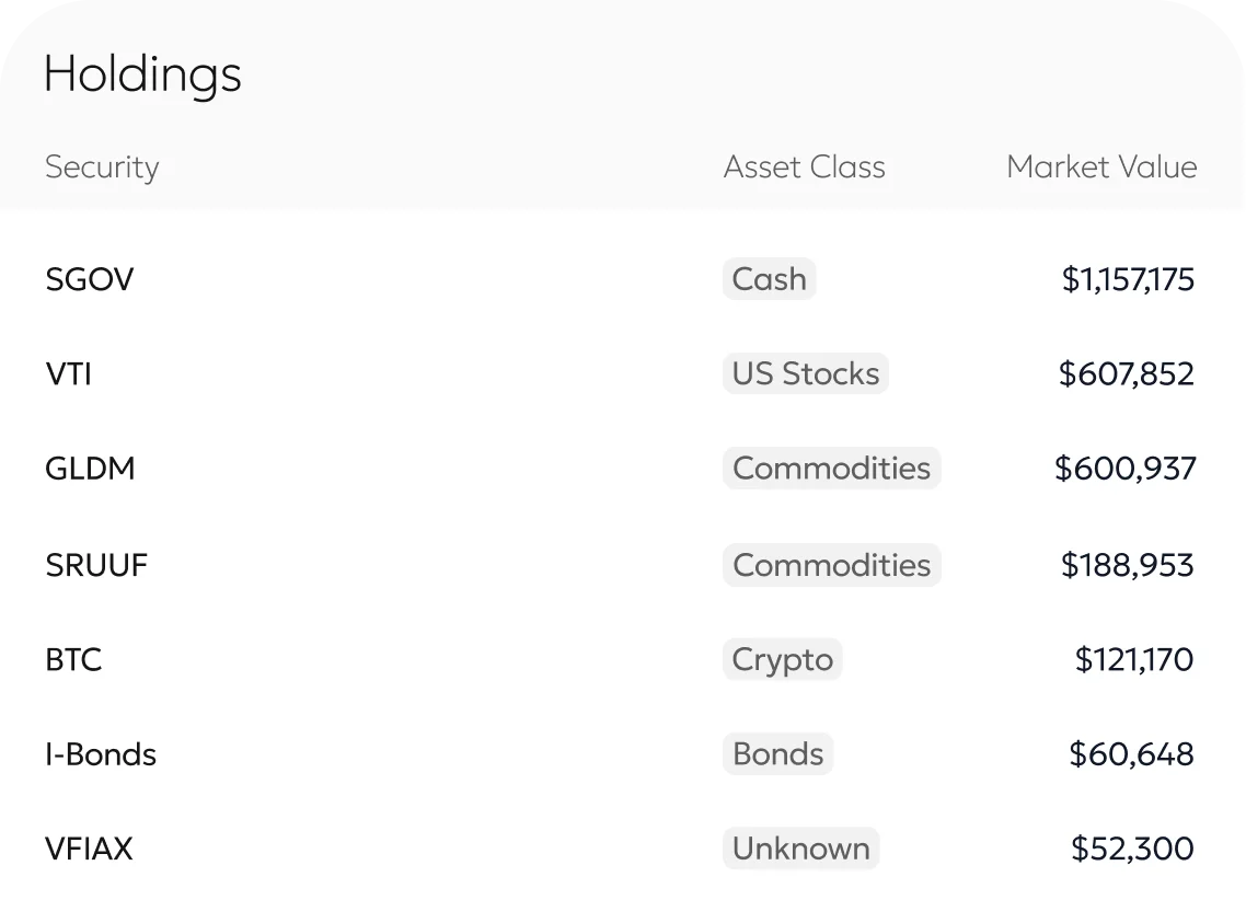 Aggregate all your investment accounts — brokerage, retirement, crypto, and more — into a single, unified view. No more logging into five different apps to understand your portfolio.